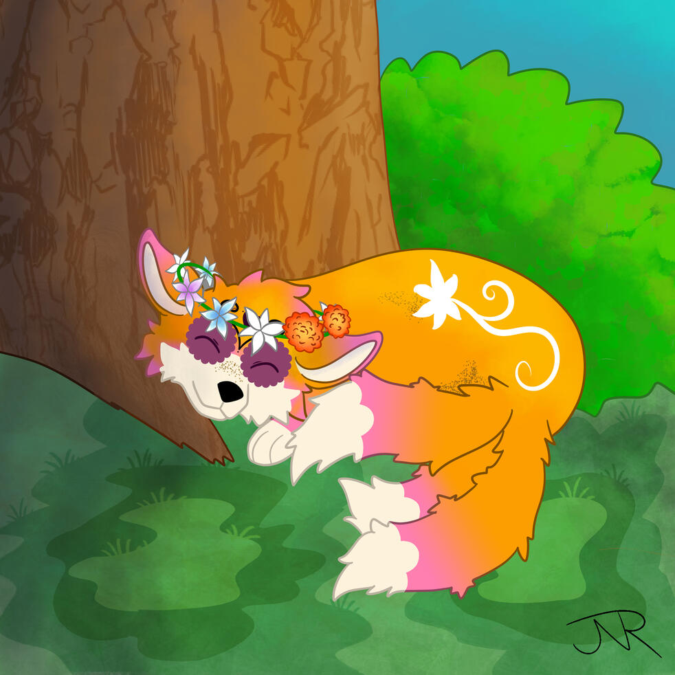Amazing art of my fursona Bloss by my boyfriend 💛He made this art piece for me as a gift and I love it so much, he looks sooo serene under his tree 💕He also made my Bloomin' logo, the one you see at the top of this page!You can check out his BlueSky profile here!