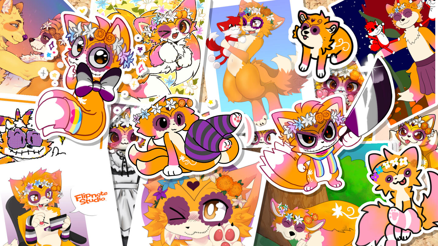 This collage of my fursona Bloss used as my BlueSky banner on my Bloomin' Yaps account was made from art I got from many artists, so I assembled everything on one big image!Here are the artists:ratfail (Top left corner, Bloss & boyfriend hugging art)